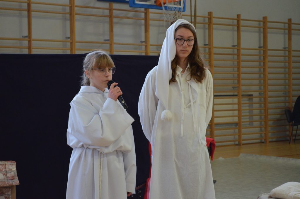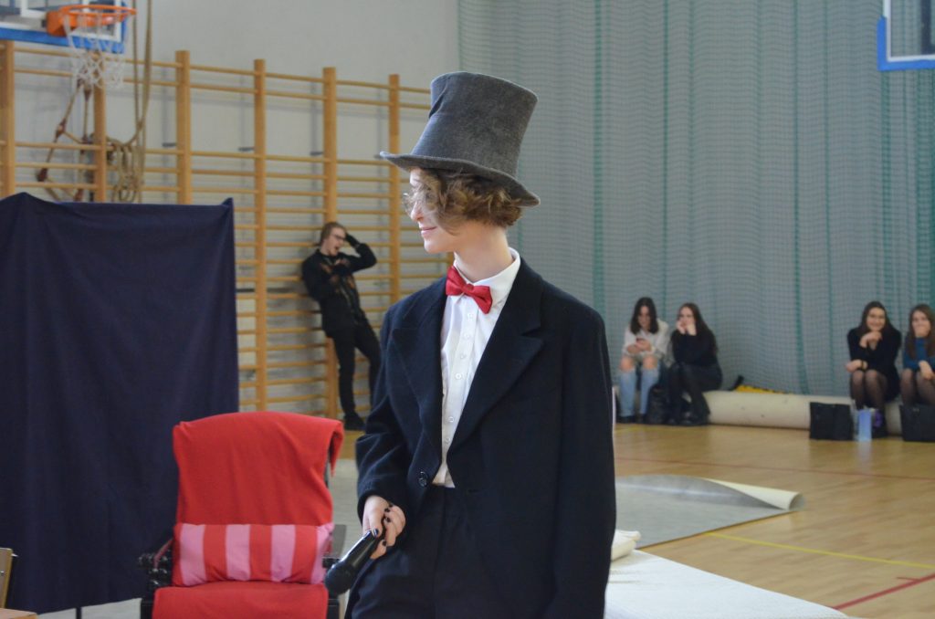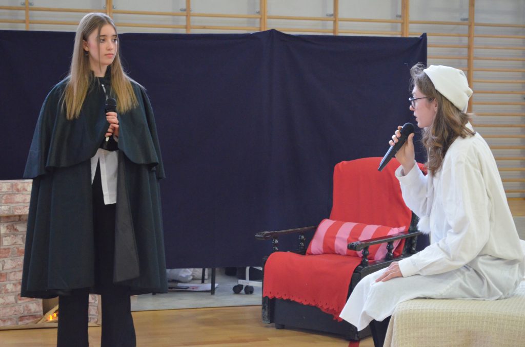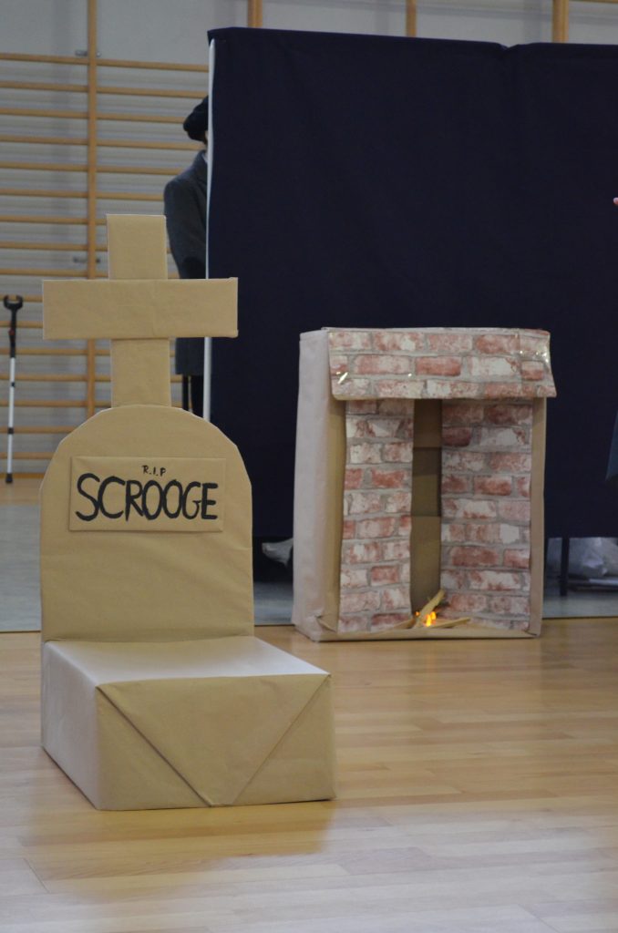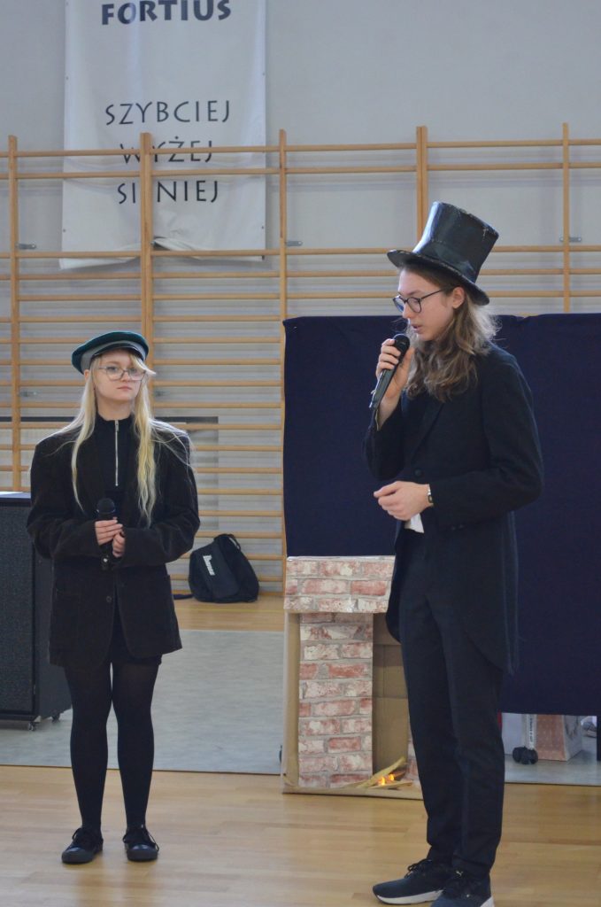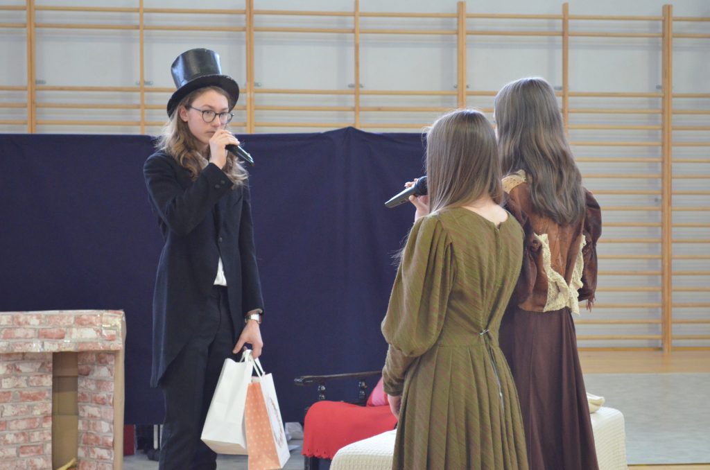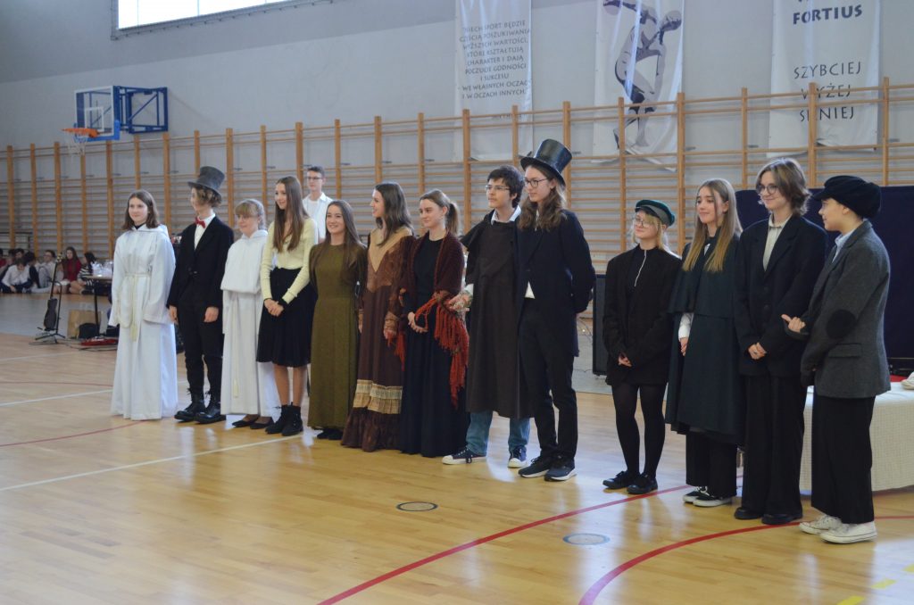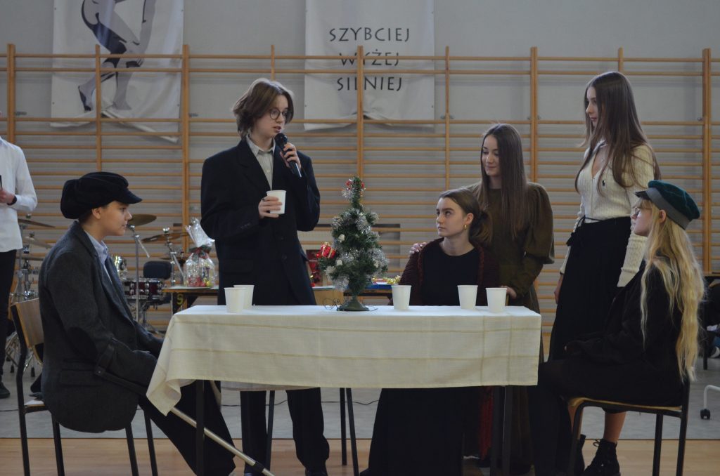 O godz. 11 wszyscy zgromadzili się na hali, by obejrzeć bożonarodzeniowe przedstawienie inspirowane utworem Karola Dickensa „Opowieść wigilijna”, przygotowane przez uczniów klasy I e, I c i IV a. Młodzi aktorzy dzięki wspaniałej grze, kostiumom i scenografii pokazali swoje artystyczne talenty i wprowadzili nas duchowo w klimat świąt.