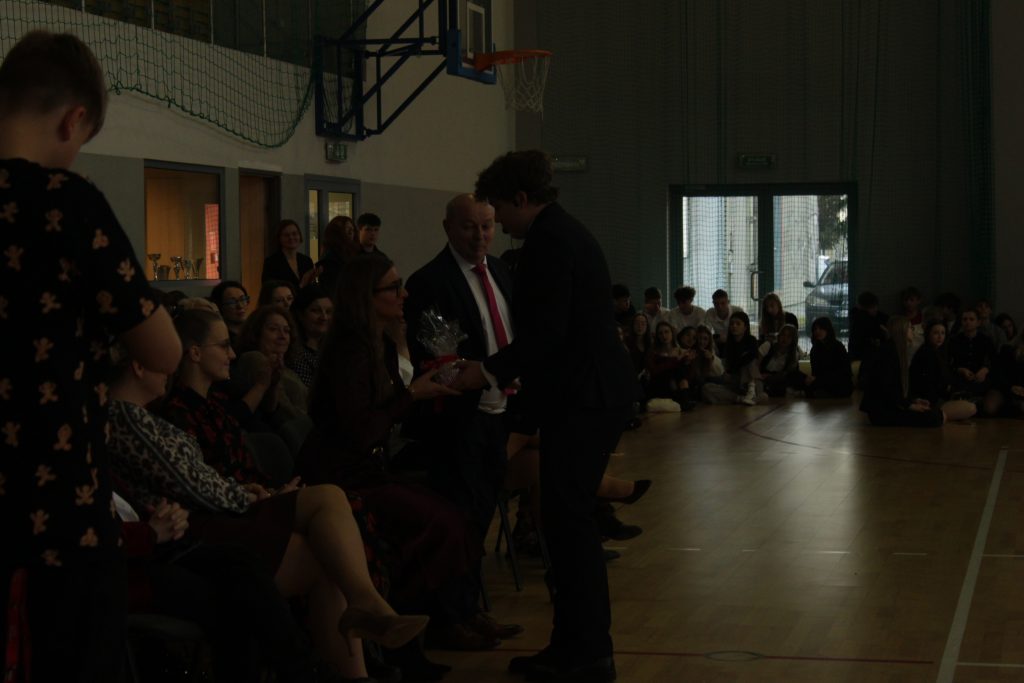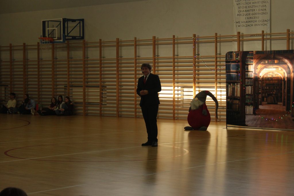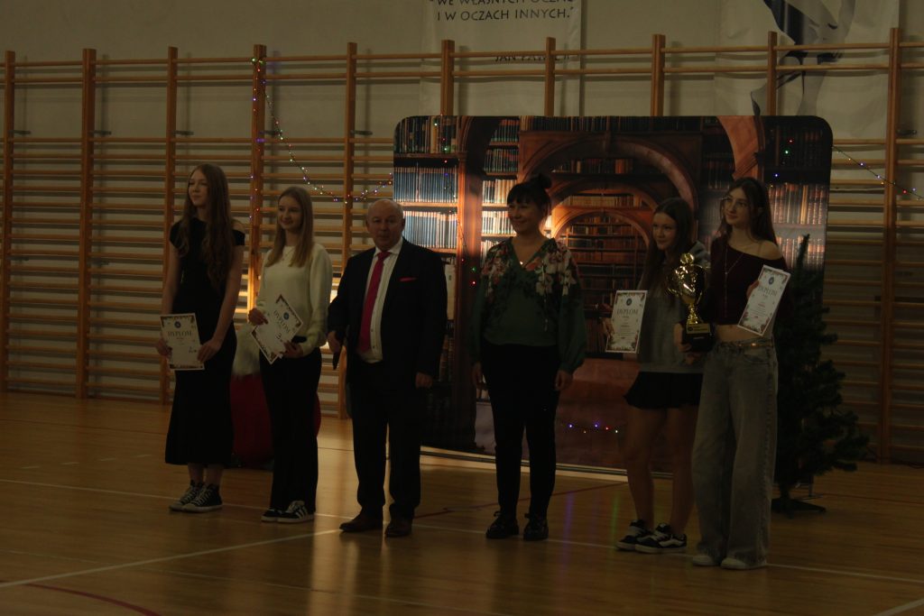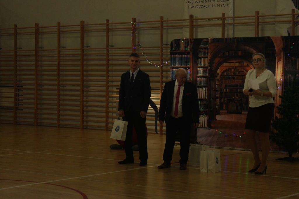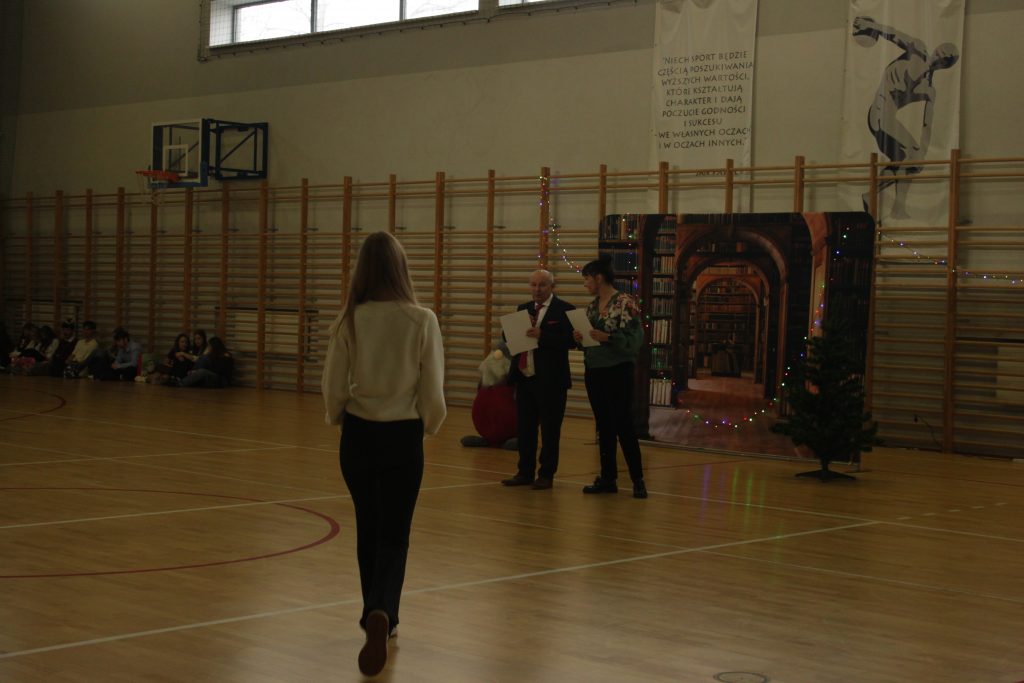 Następnie pan dyrektor Jan Randak złożył wszystkim najlepsze życzenia na święta Bożego Narodzenia i nadchodzący Nowy Rok. Rozdano też nagrody laureatom dwóch szkolnych konkursów: z języka angielskiego i za kiermasz bożonarodzeniowy.
